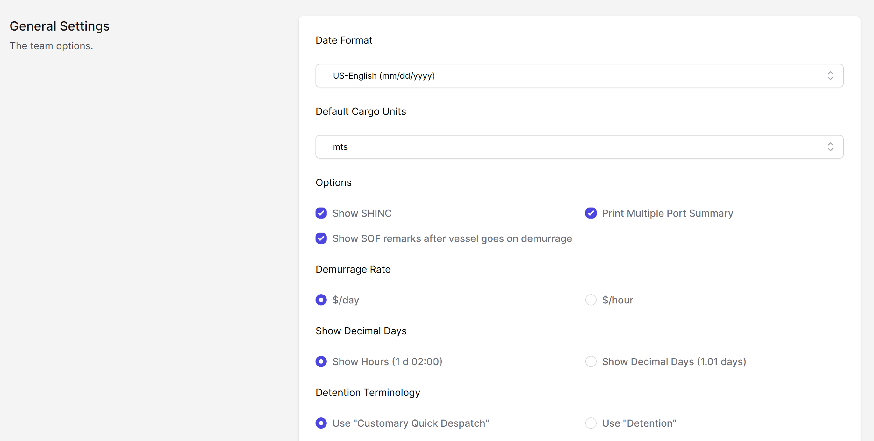 The General Settings section allows you to modify various settings which apply to each laytime calculation. Notable settings: