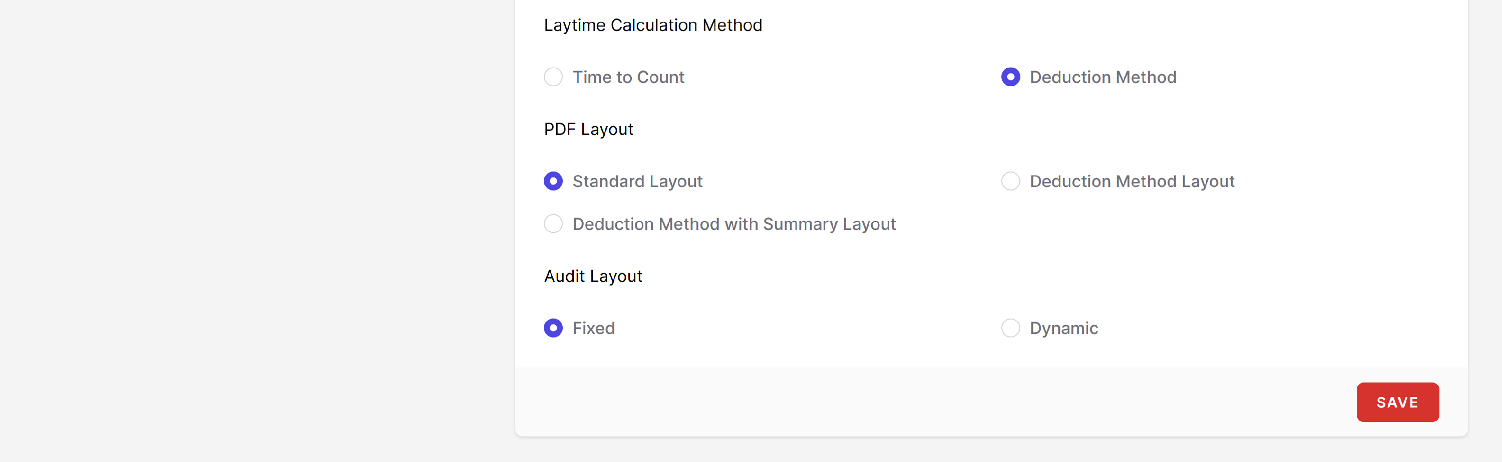 - Deduction Method with Summary Layout: Same as the Deduction Layout, with the addition of a summary table for each load and discharge port that shows the total time used in each port.