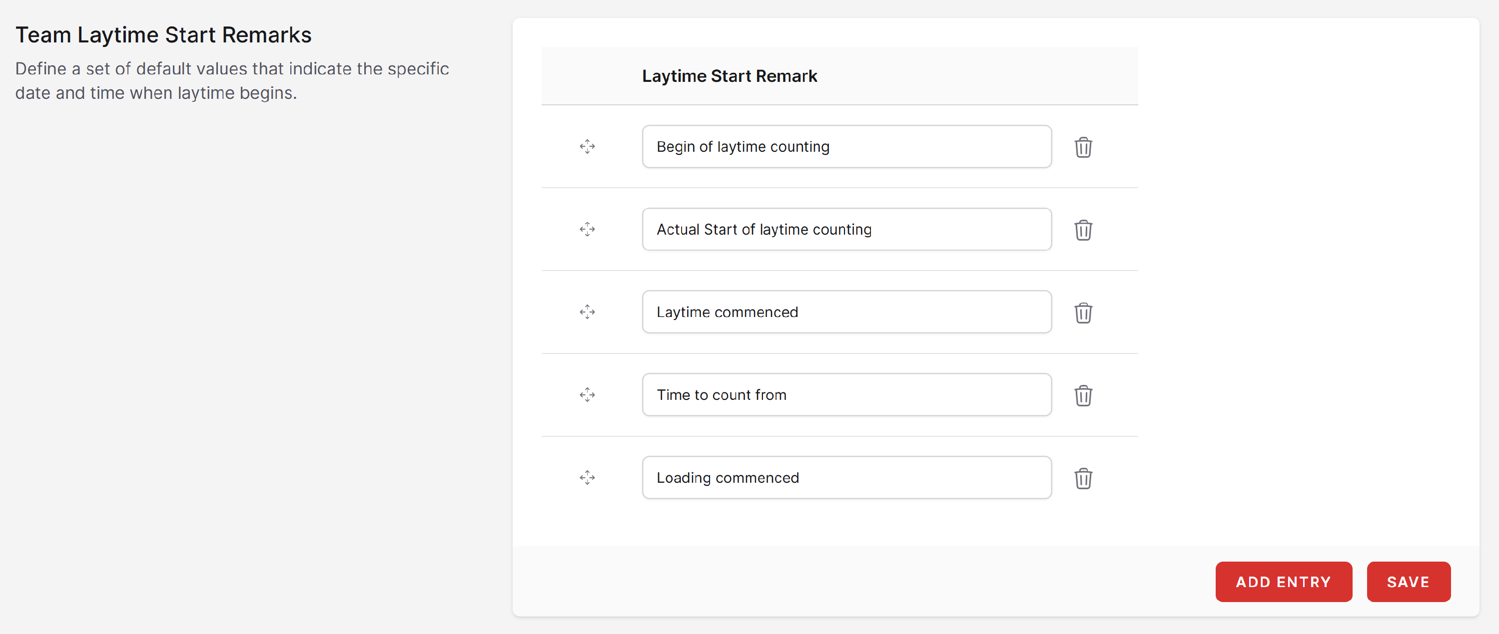 The Team Laytime Start Remarks section allows you to customize the list of entries available for selection in the "Laytime Commenced" dropdown menu on the Port Details page of a calculation.
