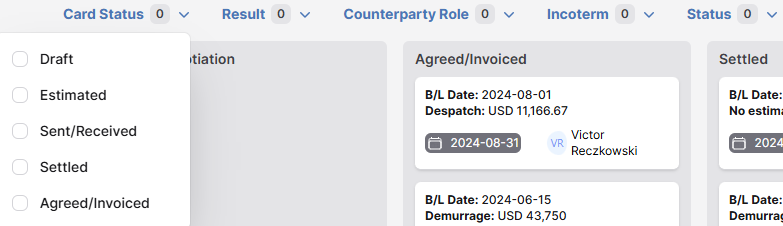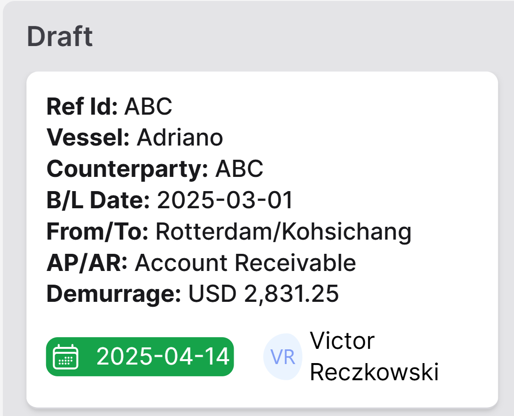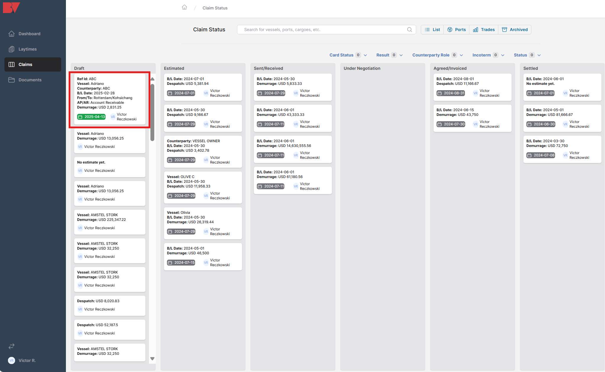 Burmester & Vogel's Claims module is a kanban view of the BV Laytime Tracker and a way of viewing all the laytime files (.BVLs) within a given team. This is the product of several decades of expertise in service to and monitoring of the demurrage industry. The system provides Trade Execution and Demurrage teams an overview of active demurrage claims, profit and loss, and tools to monitor the status of each claim. The ability to quickly collaborate with colleagues and identify demurrage exposure accelerates the demurrage settlement process.