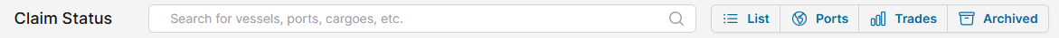 At the top of the screen is the search bar that enables users to quickly search for laytime files matching with corresponding data (e.g., search for any calculations with Cargo = Fertilizers, or Port = Rotterdam). Next to the search bar is the list view, where users can choose to view the files as a list, per port (i.e., multi-port calculations list each port discretely), by trade, or any archived files.