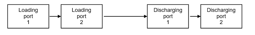 The following illustrates how these the options are implemented in the BV Portal. Deviating from the example we've set up previously, we will use different example here to illustrate all options: a calculation involving 2 loading and 2 discharging ports like this: