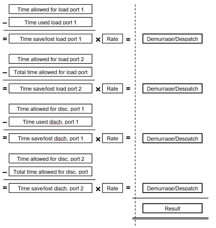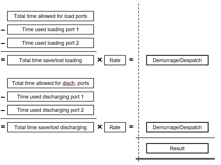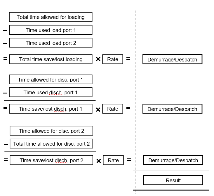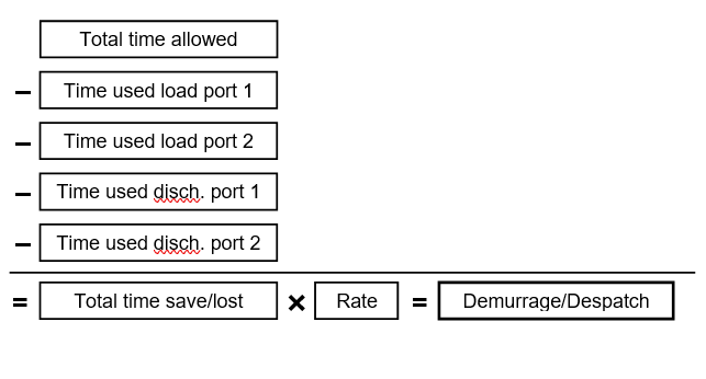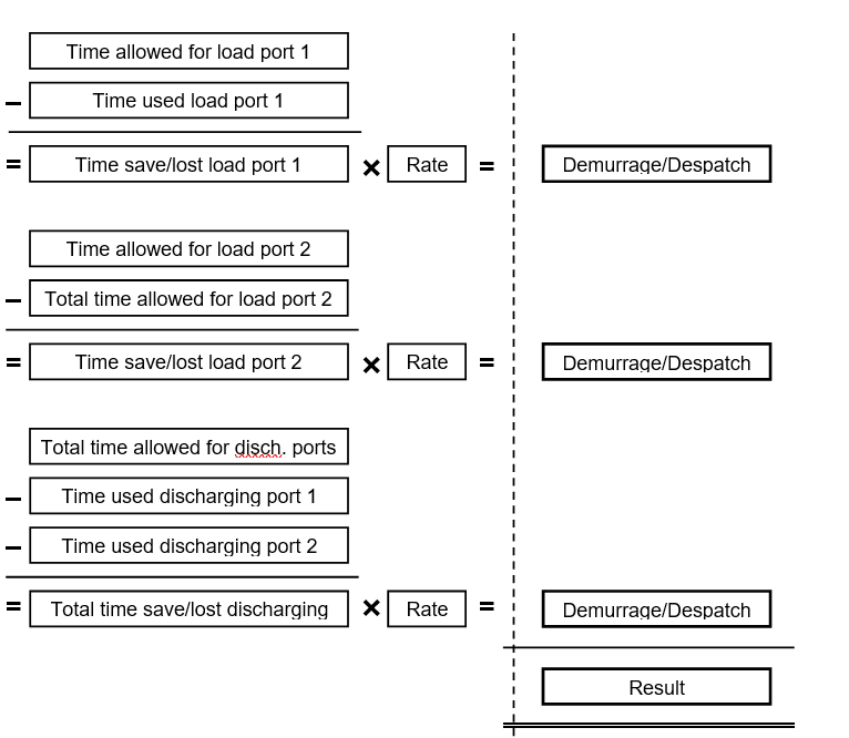 Also, all accountable time used in discharging ports and all time allowances for discharging ports will be summed, then the demurrage (or despatch) for the discharging part ports is calculated.