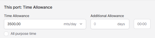 If All purpose is checked, then the given time allowance is not only for this one port but for all ports in the reversible chain. An example from the tanker business would be "72 hours all purpose loading" regardless how many loading ports are involved. If All purpose time is used the time allowance units must be set to days or hours.