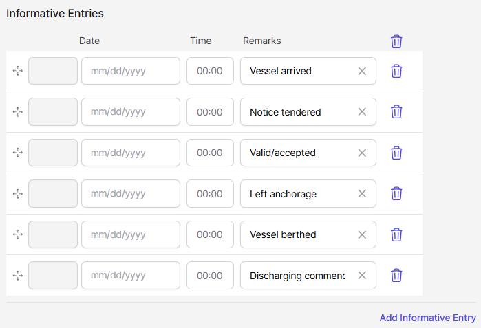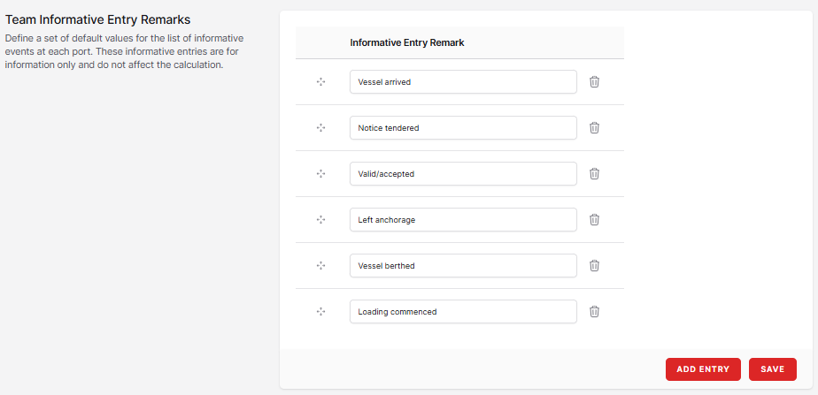Note: Team defaults for the Informative Entry Remarks, Laytime Start Remarks, and Laytime End Remarks may be defined within the Team Settings page.