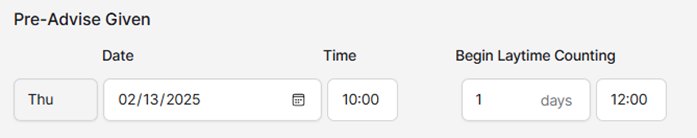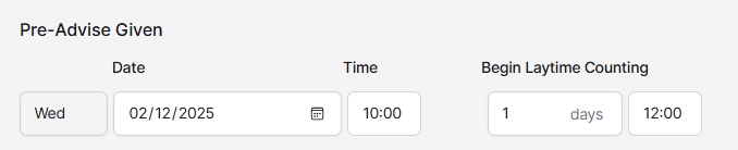 Pre advise February 12, 2025, 10:00 plus offset 1 day 12 hrs. = February 13, 2025, 22:00