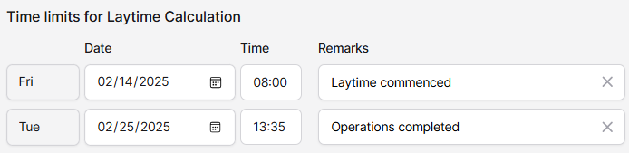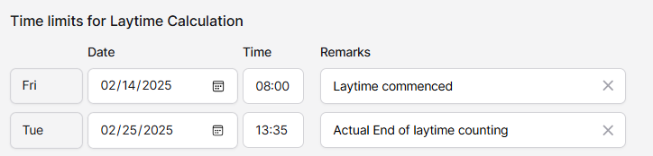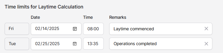Note: The BV Portal now allows users to enter custom terms to denote the beginning/end of laytime counting (e.g., Begin of Laytime counting, Actual start of laytime counting, Laytime commenced, etc.). These can be entered within the Remarks field manually or selected from the options defined by the team within the Team Settings Page.