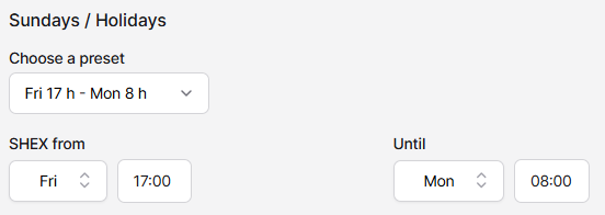 Let us assume that we have normal SHEX from Friday 17:00 until Monday 08:00 not to count unless used. Further we will have a working period on Saturday from 09:00 until noon followed by a one-hour meal break until 13:00 and a second working period after meal break until 16:00.