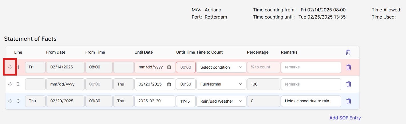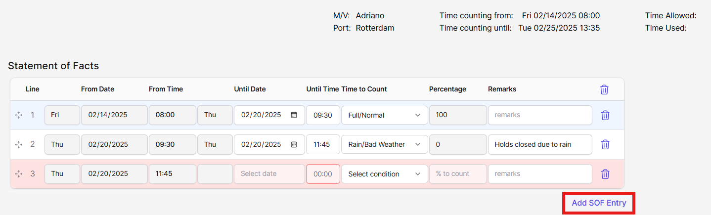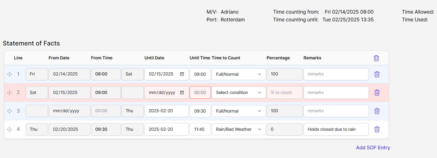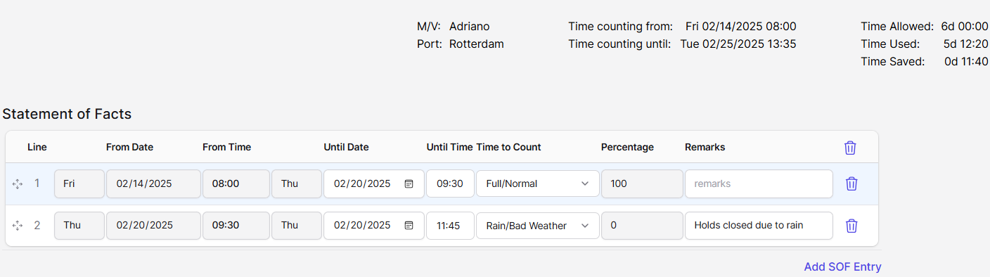 Note: Whenever you add a line to the SOF, the "From Date" and "From Time" will be auto populated by the "Until Date" and "Until Time" from the previous line. In the case where you're adding an entry to the first line, these field will populate from the date/time you specified laytime to commence on the Port Details page.