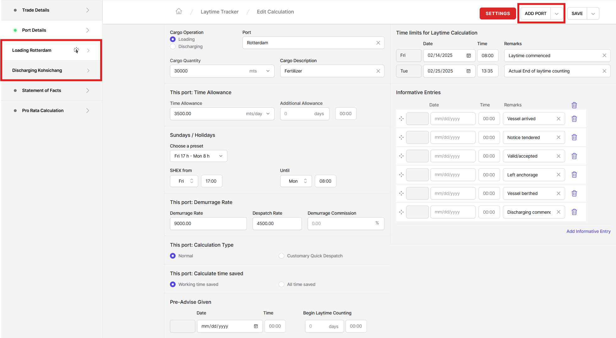 If you add new ports to the calculation the program will sort the ports chronologically based on the date the laytime calculation starts (Time limits for laytime calculation).