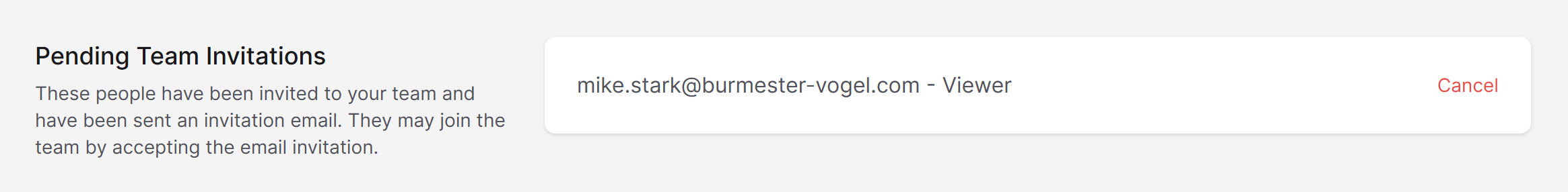 Once a team member is added, they will appear in the Pending Team Invitations section of the Team Settings page. They will also receive an e-mail notification inviting them to activate their account. To revoke the invitation, click "cancel".